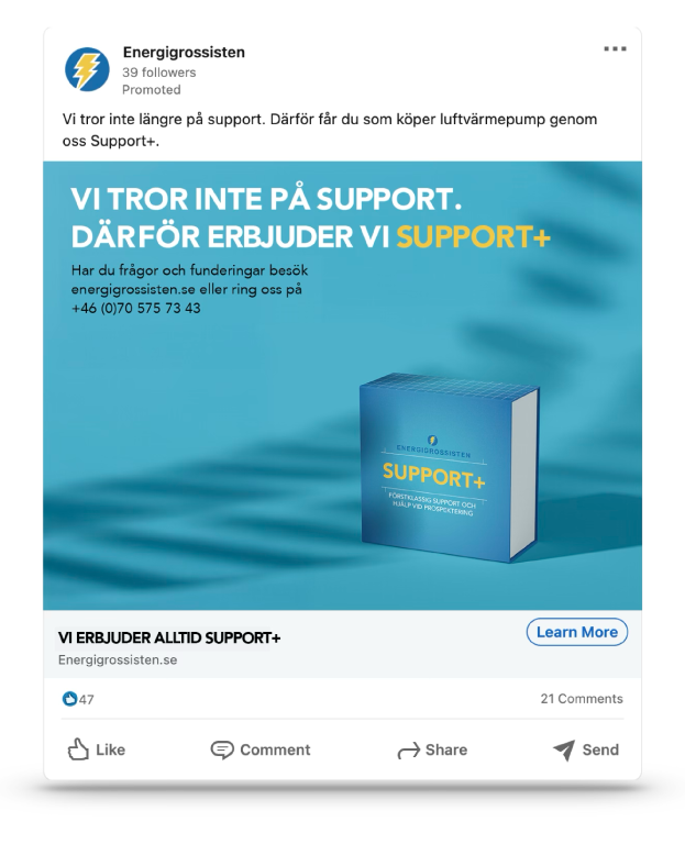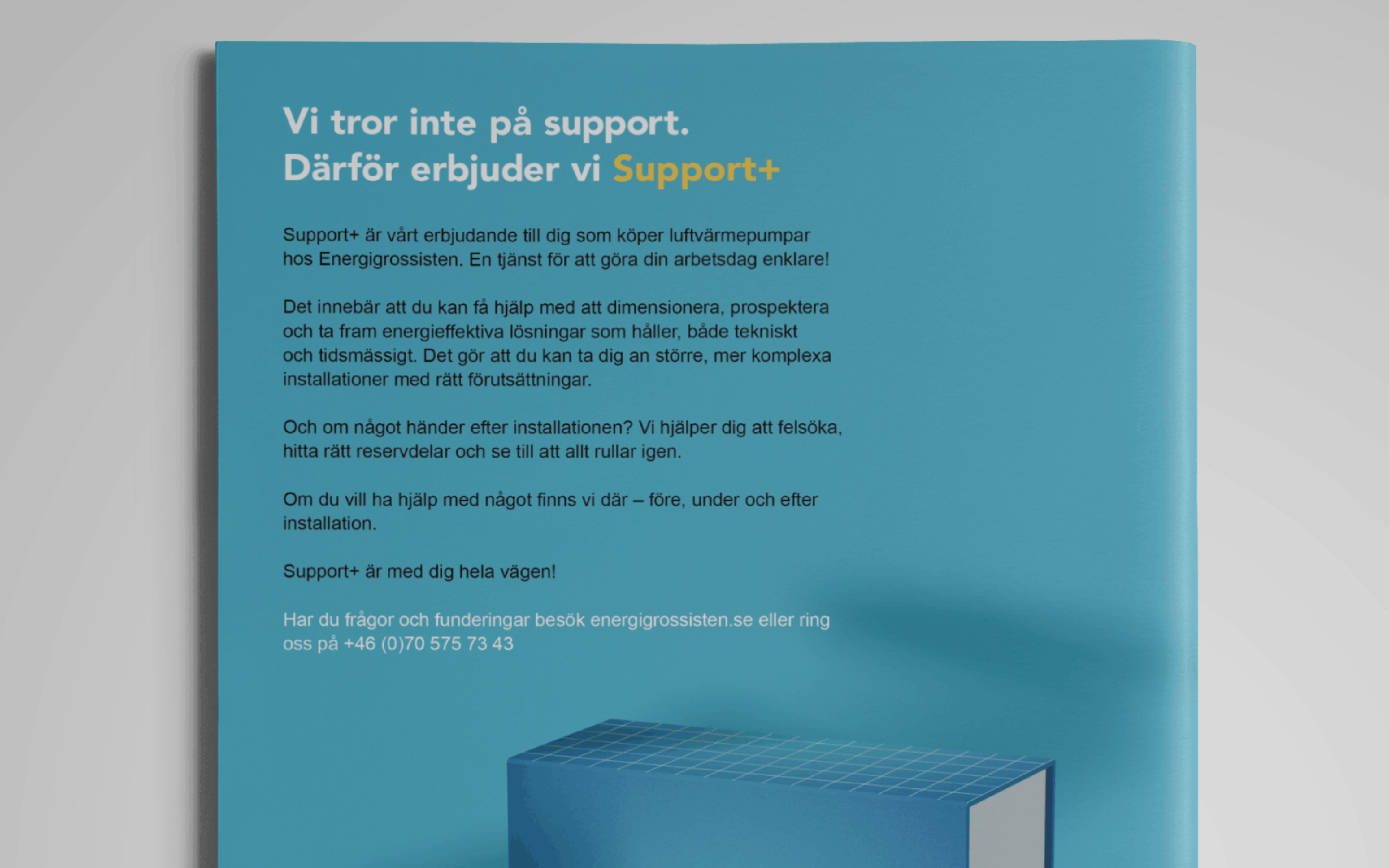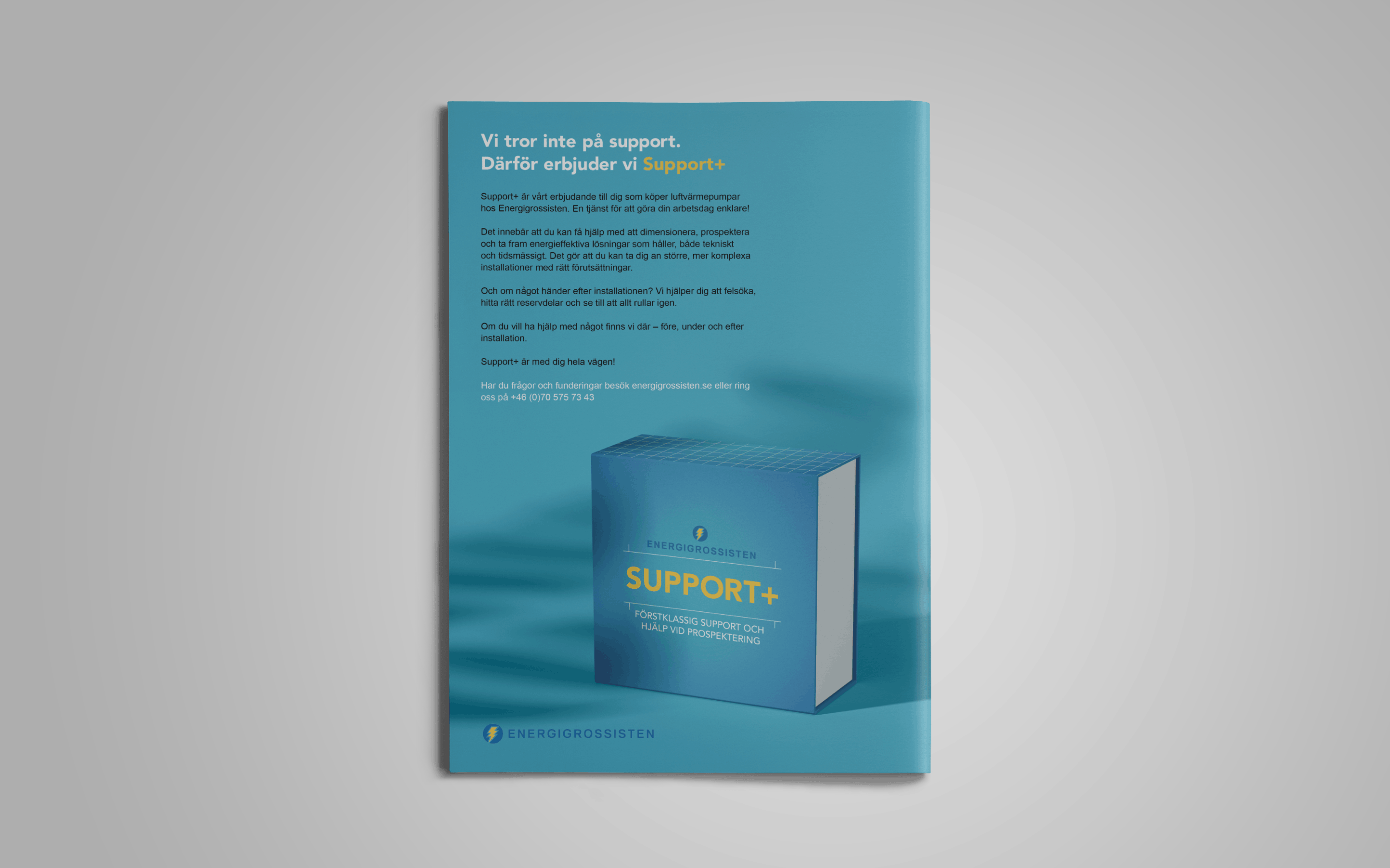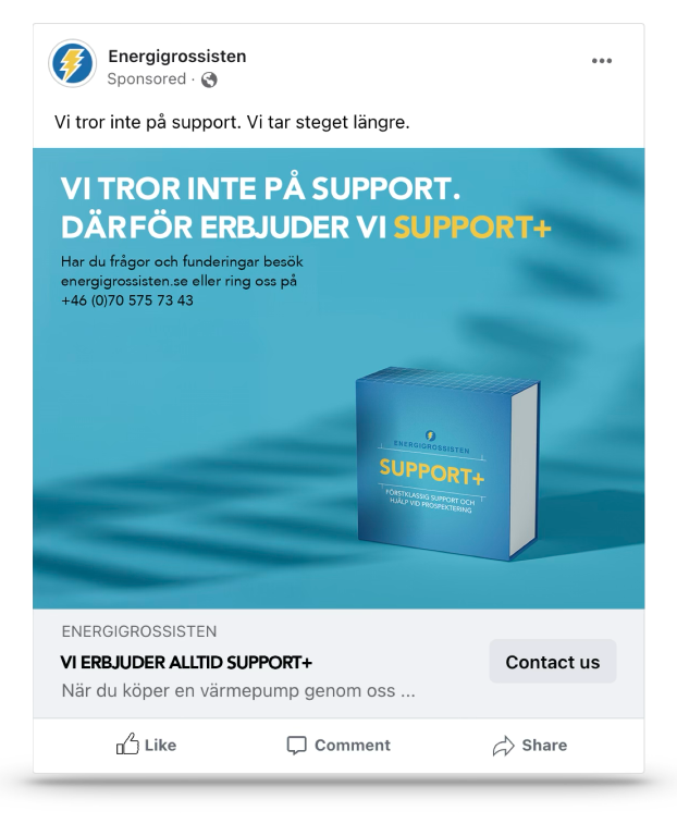 ”Support+” är en konkretisering och paketering av en bred samling tjänster som värmepumps återförsäljaren Energigrossisten erbjuder sina kunder. Det är ett steg ifrån den hårt fakta drivna kommunikationen kunden tidigare gjort. Kampanjen